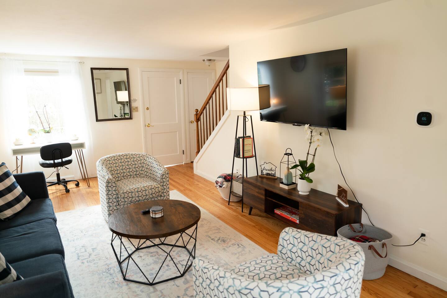 This beautifully renovated 3-bedroom home is designed for comfort and convenience. LIVING AREA: Spacious, light-filled living room perfect for relaxing. 55โ Smart TV for movie nights. KITCHEN & DINING: Fully renovated kitchen with modern countertops and stainless steel appliances. Stocked with everything you need to prepare home-cooked meals. BEDROOMS & BATH: Three cozy bedrooms, each designed for rest with plush bedding and comfortable mattresses. Two bedrooms include their own 43'' Smart TVs. One freshly updated bathroom with modern fixtures, premium toiletries, and plush towels. WORKSPACE & AMENITIES: Dedicated workspace with a desk and high-speed Wi-Fi. Brand-new central air conditioning and furnace to ensure comfort in any season. Book Your Stay Today!